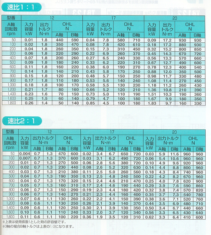 額定傳動能力表