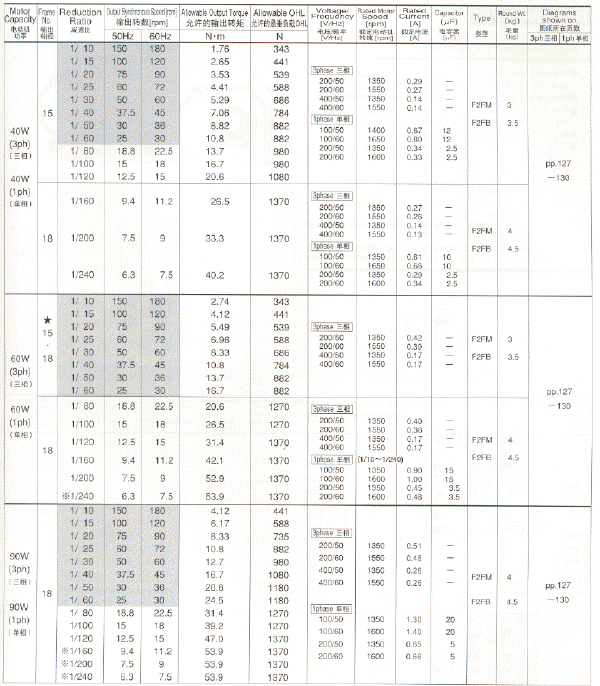 ★對(duì)三相60W機(jī)型,減速比為1/10~1/60,當(dāng)輸出徑為”15“時(shí),適用于標(biāo)準(zhǔn)電壓,“18”適用于其他規(guī)格