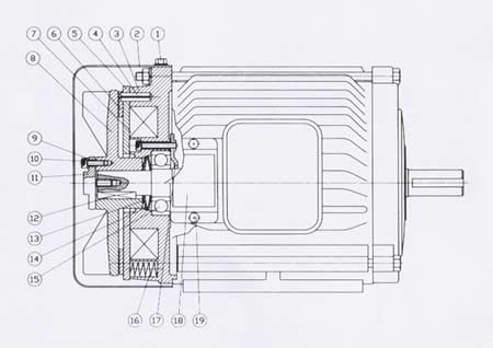 彈簧推出,使銜鐵盤上的摩擦片與制動板產生摩擦,而迅速將馬達制動。